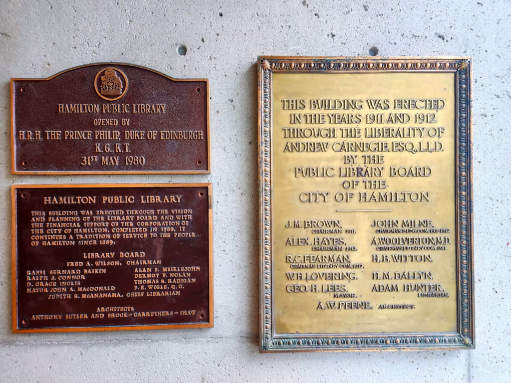 En 1913, la bibliothèque publique de Hamilton inaugure son nouveau bâtiment principal grâce au financement d’Andrew Carnegie.