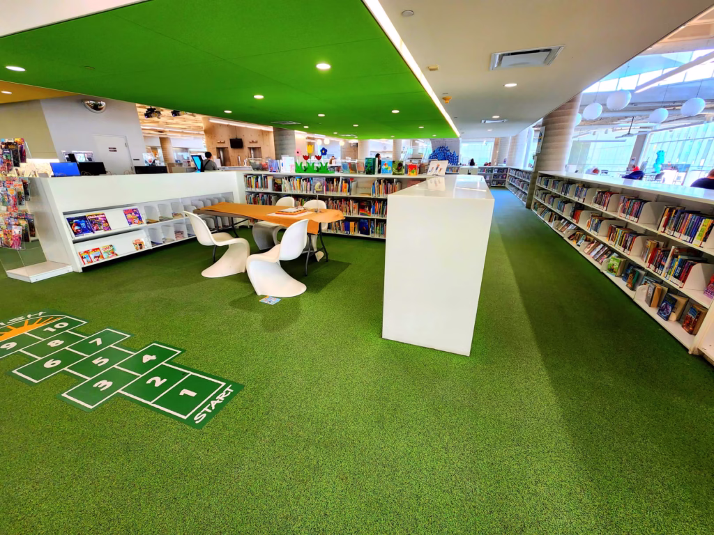 Photo de la Bibliothèque publique de Hamilton. À gauche, la façade moderne en béton et verre avec le logo bleu « Hamilton Public Library ». À droite, l’intérieur lumineux de la section jeunesse avec sol vert, tables blanches, étagères remplies de livres et un jeu de marelle imprimé au sol.