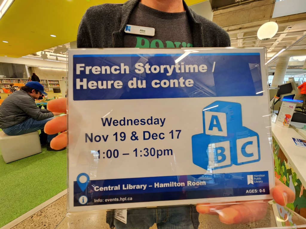 Surprise agréable : la réceptionniste nous indique non seulement les rayons en français, mais aussi tout un programme d’activités bilingues. La bibliothèque publique de Hamilton ne se contente pas d’offrir des livres en français : elle déploie un véritable programme pour la communauté francophone et francophile.
