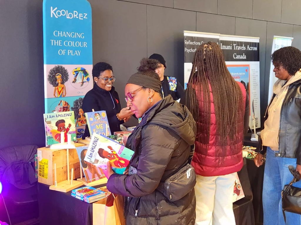 Sur la droite, le stand coloré de Koolorez attirait enfants et parents, tandis qu’au fond, une exposition entièrement tournée vers la jeunesse invitait à voyager : la collection Imani Travels Across Canada, bilingue elle aussi, menait les plus petits à travers les paysages et cultures du pays.