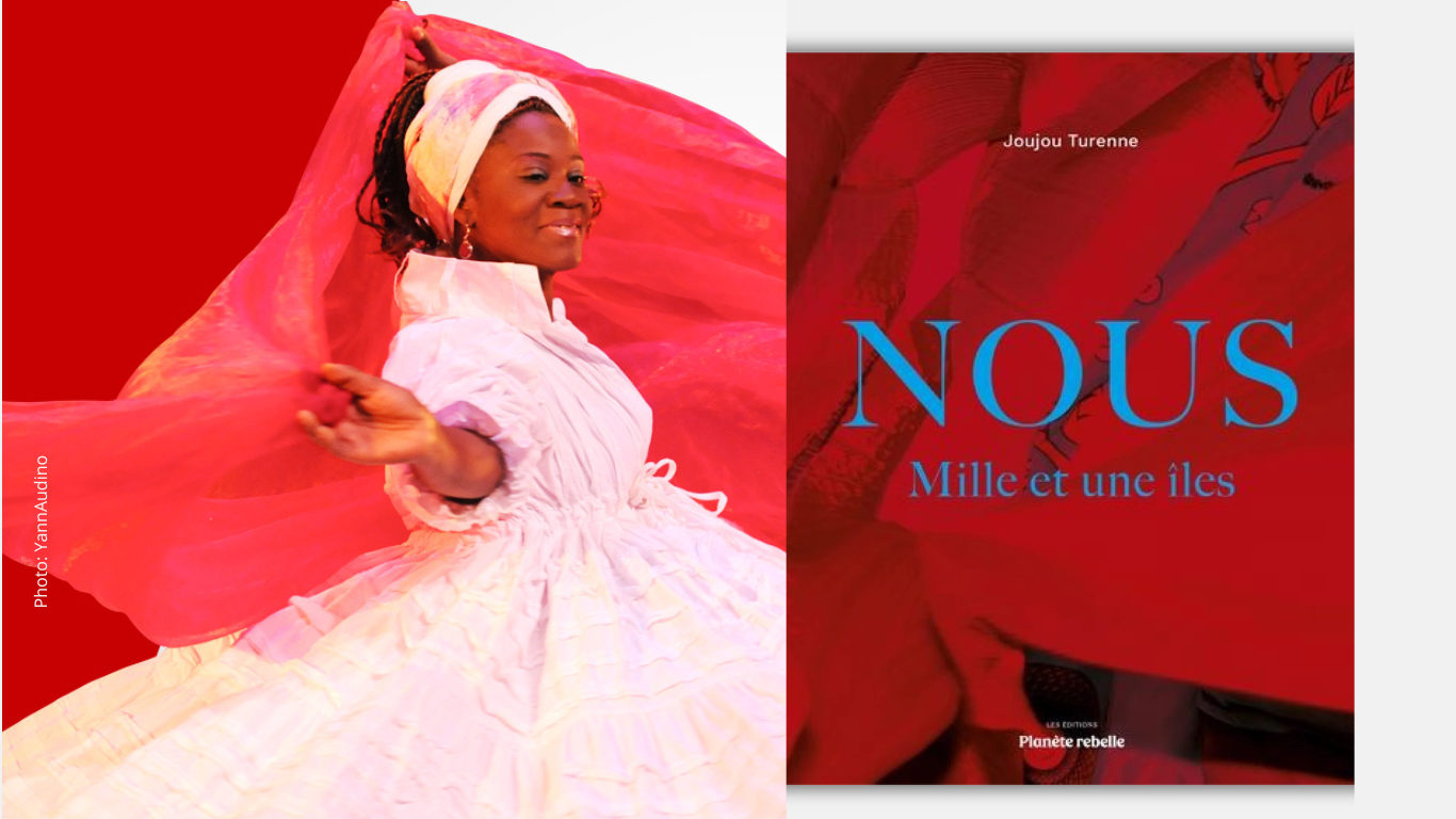 La conteuse Joujou Turenne, amie du vent, a publié son dernier recueil Nous, mille et une îles aux éditions Planète Rebelle en ce début d’année 2026. Fidèle à sa passion de l’Autre et aux grains de liberté et d’espoir qu’elle sème depuis trente-cinq ans à tous vents et horizons. Des Amériques aux Caraïbes, de l’Europe à l’Afrique, jusqu’au cœur des enfants; les éclats de rêves glanés ici et là se transforment encore en pas, en voix, en pages et en encre pour nourrir l’infini de l’imaginaire.