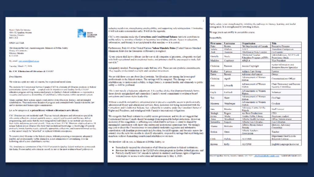 Signée par plus de 2 000 personnes et organisations à travers le Canada, la lettre met en lumière l’importance des bibliothécaires en milieu carcéral et presse le ministre de renoncer à toute suppression de ces postes. Pour les signataires, ces professionnels jouent un rôle central dans le maintien d’un accès équitable à la culture, à l’éducation et à l’information pour les personnes incarcérées.